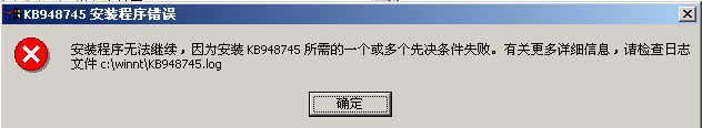 0.094: KB948745 安装程序遇到了一个错误: 安装程序无法继续,因为安装 KB948745 所需的一个或多个先决条件失败。有关更多详细信息,请检查日志文件 c:\winnt\KB948745.log