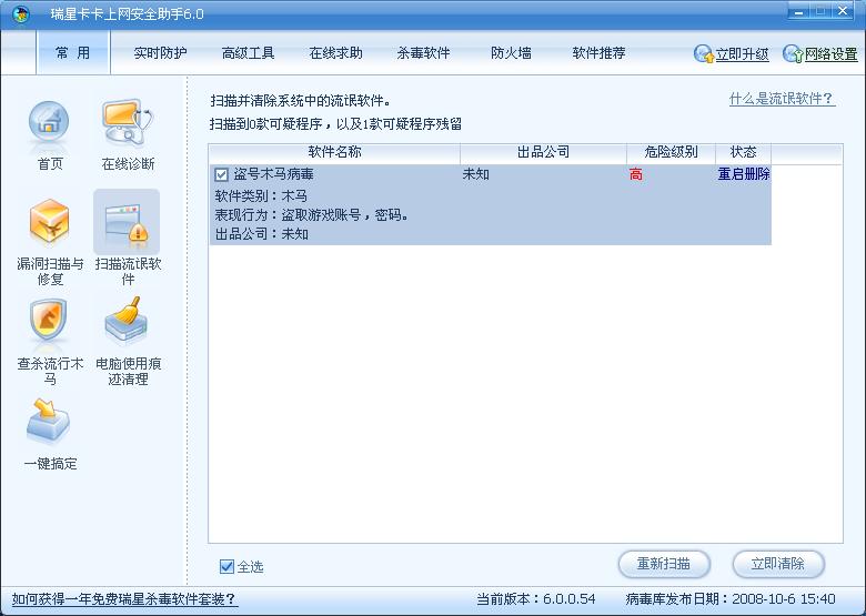 我用卡卡的扫描流氓软件发现有盗号木马病毒,点立即清除后重启,启动后再查还是有盗号木马病毒再清除就循环下去怎么也杀不了