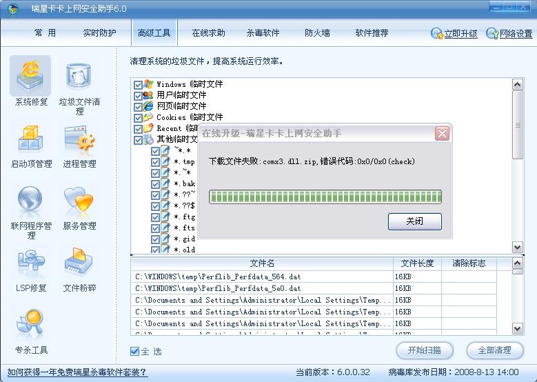 打开“我的电脑”--C盘--Program fills--Rising--AntiSpyware--Update--把里面的文件全部删除了--再升级.