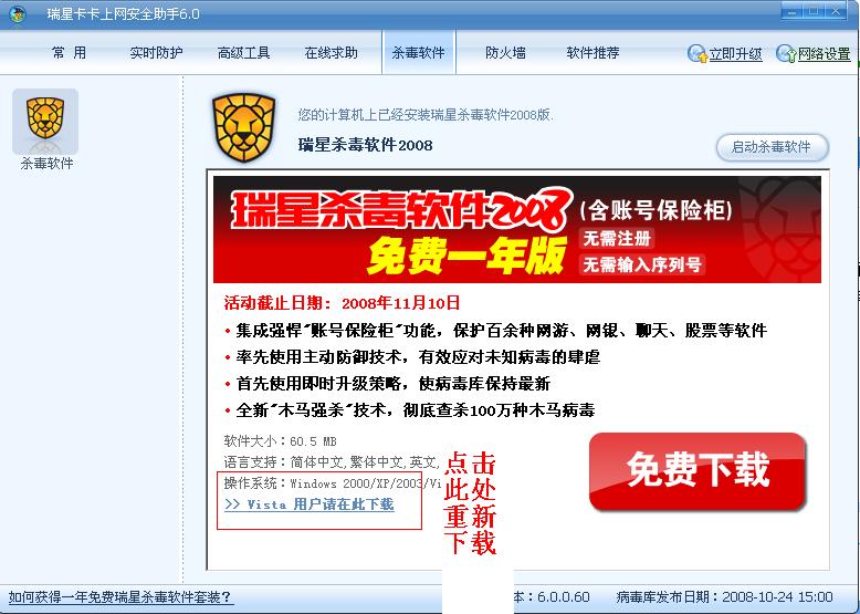免费的瑞星要求先装卡卡,然后从卡卡上下载瑞星和防火墙,防火墙装上了,可是瑞星杀毒不行,下载了一个194KB的瑞星文件,点击后任务栏出现一个瑞星狮子图标,提示正在安装,可是不久就自己消失了,无法安装瑞星,反复试过都是如此,这东西应该怎么解决?