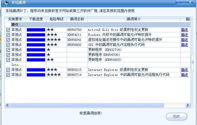 我更新了N次,用360更新说安装失败,用卡卡更新提示修复完成,但是重新搜索漏洞依然存在,请问各位高手要如何解决!!