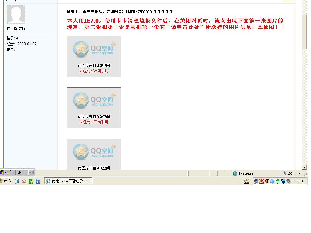 本人用IE7.0,使用卡卡清理垃圾文件后,在关闭网页时,就老出现下面第一张图片的现象,第二张和第三张是根据第一张的“请单击此处”所获得的图片信息,真郁闷!!
