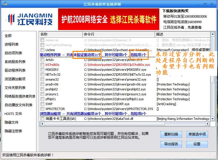 而现在试用江民发现其在反rootkit方面很好,建议卡卡改进!!!