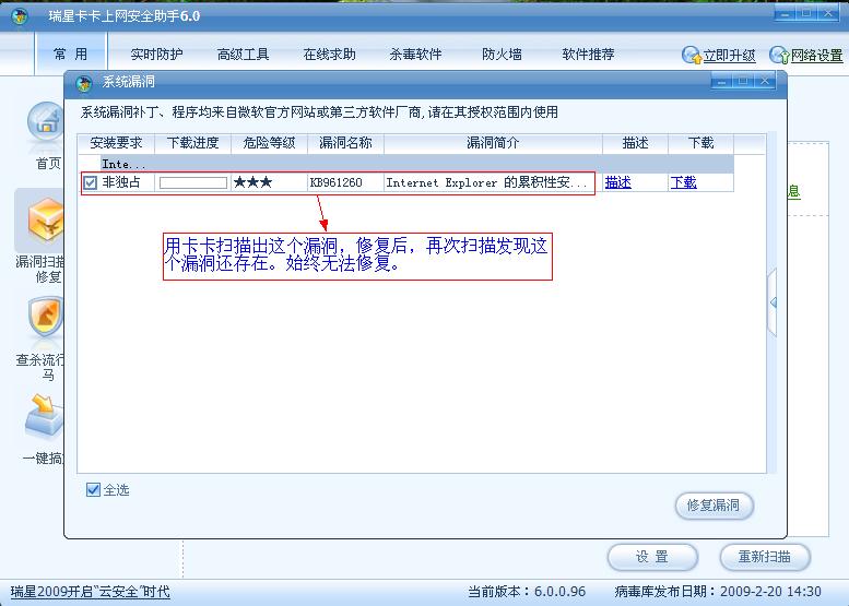 卡卡无法打上补丁KB961260——希望瑞星工作人员帮忙解决一下