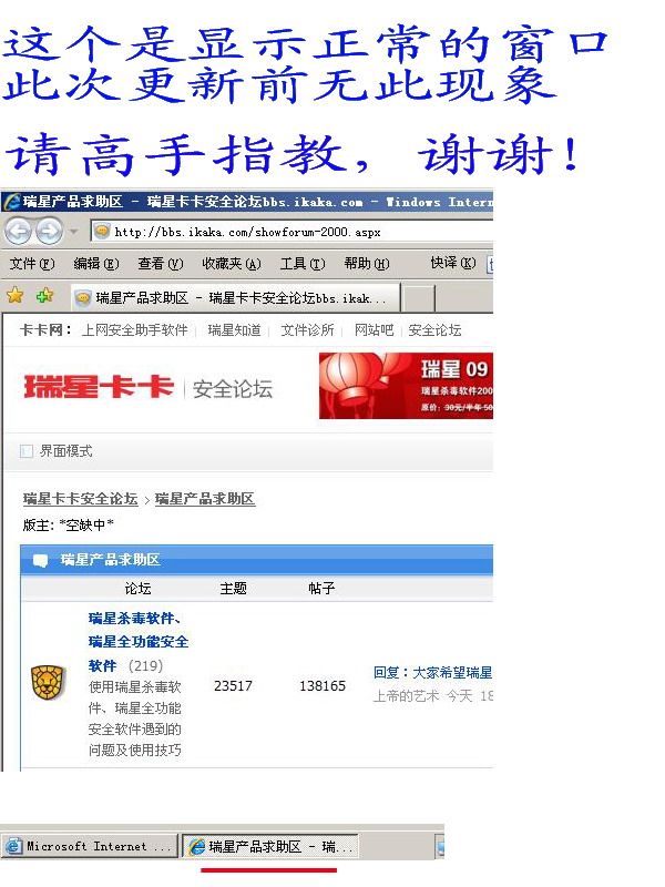 [求助] 前天卡卡扫描出的 IE 漏洞,打好补丁后 IE 出了状况 ,请指教