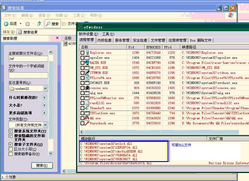 PS:一般建议远程,或者是其它,建议首先结束掉可疑的进程,然后再处理掉可疑的DLL文件。因为EXE和DLL文件是最好处理的。下面将说明的是:结束掉可疑EXE程序及将可疑的DLL程序都重命名后,使用瑞星卡卡安全助手的启动项管理检查可疑的启动项,及发现病毒创建的驱动。