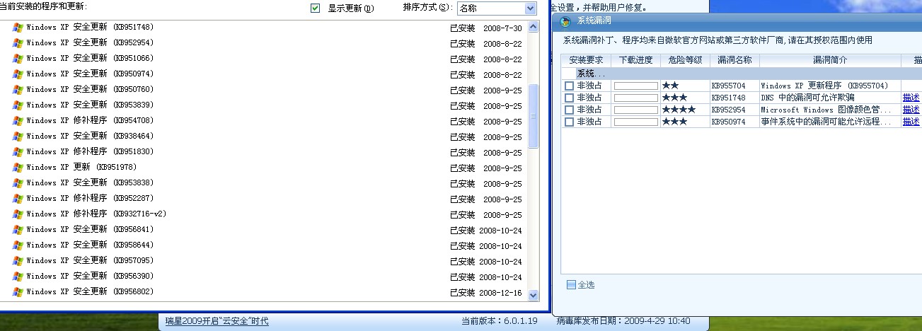 后来发现没打上的几个补丁 以前就打过了~ 好像就是卡卡今天升级后 才扫描出来的 前些天没有的 这是怎么回事啊?