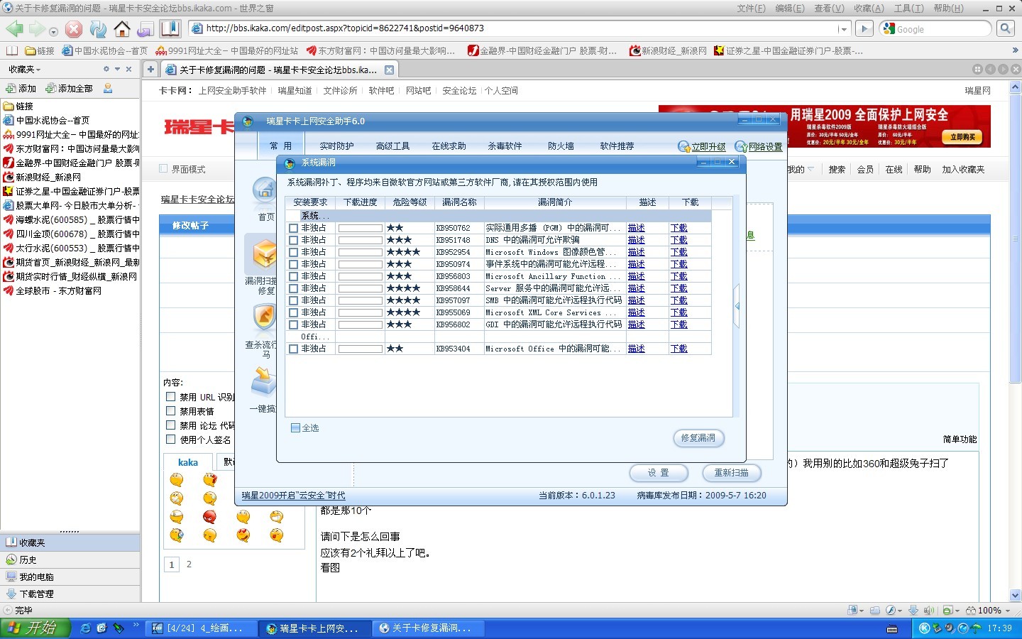 升级卡卡至最新版本:6.0.1.24,使用卡卡扫描漏洞,再使用windows update扫描,如有windows update扫描不到,卡卡可以扫描出的漏洞,请提供系统版本信息(要精确到是xp sp1还是xp sp2)和不能修复的补丁号