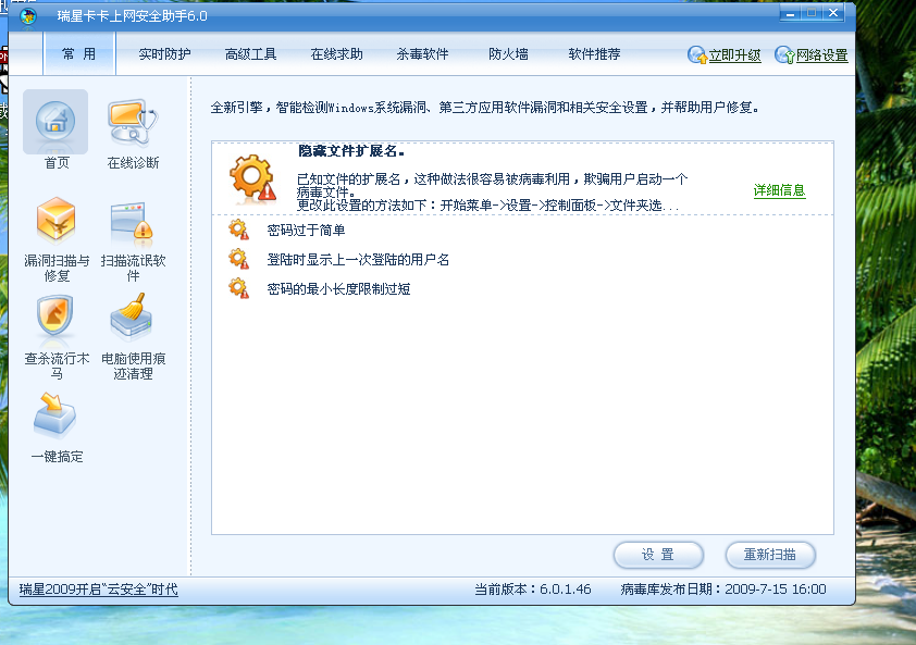 那漏洞的发布时间显示是7月21日, 而瑞星卡卡的病毒库版本只是7月15日.我想是这个原因所以扫描不到吧.