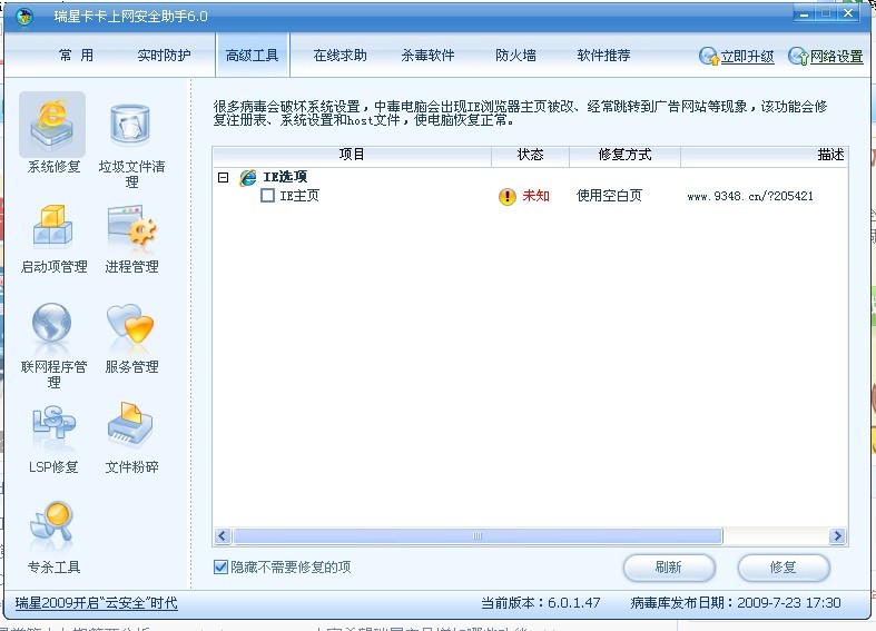 IE首面修复不了。autorun病毒修复不了。瑞星2009最新版查杀不到。 autorun新型伪装木马查杀不到 Explorer.exe 伪装木马查杀不到 等等。。。用了好多年瑞星了,这些常见病素还是杀不到。只能用专杀工具,是时候要放弃瑞星2009了,2010版的只能是隔离但也修复不了系统,只要瑞星一退出马上又生成文件
