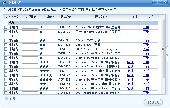 打开详细信息,选择你要打的补丁,也可以选择左下方的“全选”,然后选择右下方的“修复漏洞”。