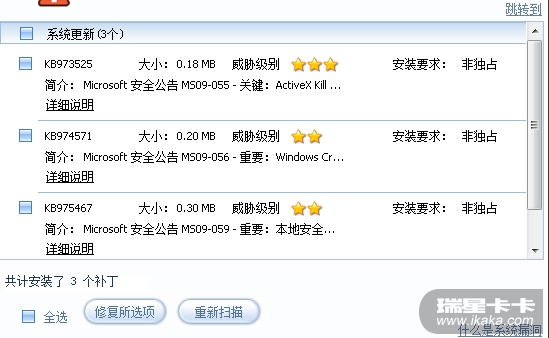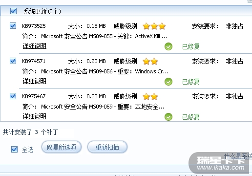 最近装了WIN7 32为系统后用卡卡差了下漏洞能查出来好几个然后修复了一下全部显示以修复但是之后点击重新扫描后有要我重新修复仿佛就像刚才没修复一样这是怎么回事啊