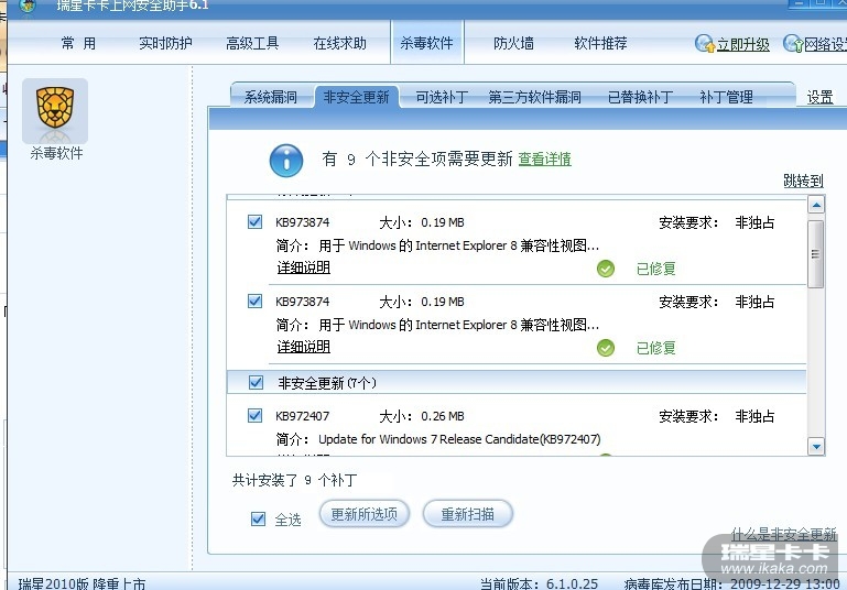 瑞星全控能软件检测到9个漏洞...但是卡卡不能修复......修复还有.............我用的的是win7 旗舰版系统...........应该怎么办啊,谢谢