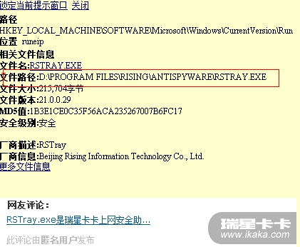 它的文件位置(省略之前的安装位置)在ANTISPYWARE下。请注意不要和瑞星杀毒或者防火墙的监控搞混。瑞星杀毒的启动项位置在RAV下,防火墙的在RFW下,全功能的在RIS下。