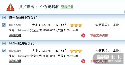 未命名.jpg (84.19 K)2011-4-24 19:37:01这二个漏洞老是补不上去,我是XP的系统,瑞星当前版本6。2。3。14,瑞星卡卡上网安全助手6。2请高手解析,谢谢!