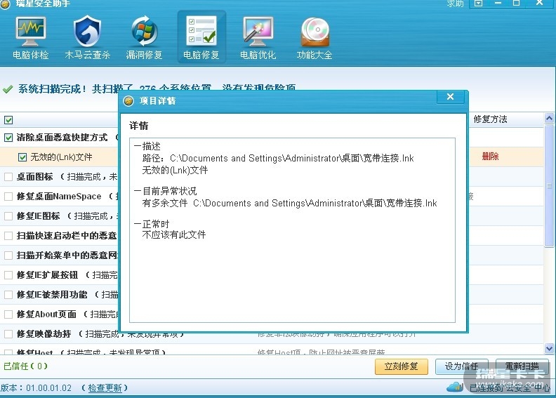 就在前几天用瑞星卡卡安全助手进行桌面修复的时候,我的宽带连接被误报为可疑文件,请问这是怎么回事,能不能解决这个问题啊,现在我战时将他加入信任模式中的,希望你们能解决这个问题