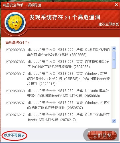 漏洞修复提示一天出现N多次,点了以后不再提示,一会儿又出来了,不胜其扰啊,怎么能关掉呢?