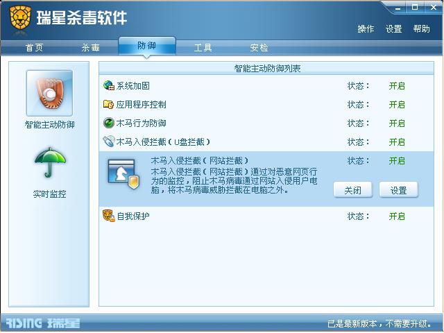 我的瑞星杀毒软件里,防御怎么没有内容,一片空白,是不是已经被吃掉了