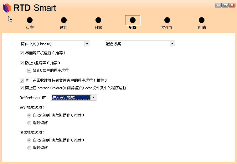 设置界面,没有多于的设置项,也不用像传统HIPS那样自己添加规则,可以设置陌生程序运行时“询问用户”、“进入测试模式”、“进入兼容模式”