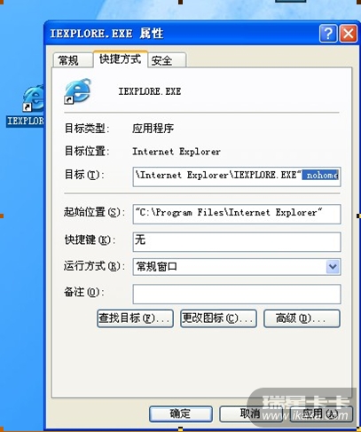 然后,用鼠标右键单击该快捷方式,选择“属性”,会弹出“Iexplore.exe 属性”对话框,选择其中的“快捷方式”标签,然后在“目标”框里填入:"C:Program FilesInternet ExplorerIEXPLORE.EXE" -nohome,给Iexplore.exe加上参数“-nohome”,输入时请大家注意在参数“-nohome”前面有一个空格,不要忘了,输入完毕。点击“确定”退出即可。(如图二所示)