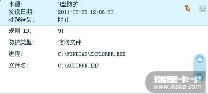 就算没有autorun.inf文件,系统自身的桌面进程也是会执行访问autorun.inf文件的命令的,瑞星的主动防御会常规性的阻止其访问autorun.inf文件的企图,并记录日志,哪怕没那autorun.inf文件,也一样阻止一次并记录日志。 也就是阻止并记录一次桌面程序的访问autorun.inf文件的命令。
