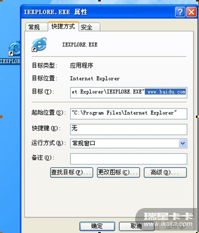 对于IE在安装时自己建立的快捷方式,我们无法为它加上上述参数。如果不信可以试试,用鼠标右键点击桌面上原来IE自建的快捷方式,选“属性”,会发现“目标”栏、“起始位置”栏、“快捷键”栏和“运行方式”栏都是灰色不可选取状态。这就是它们之间最大的不同!也是本文的关键所在。