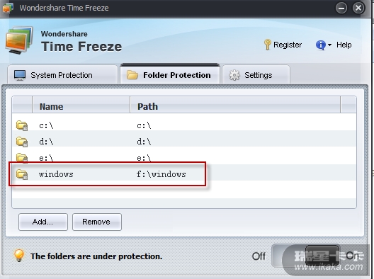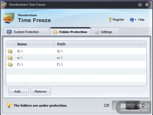 2、Wondershare Time Freeze的“文件夹保护”状态。可以将非系统分区作为文件夹完整地保护起来。
