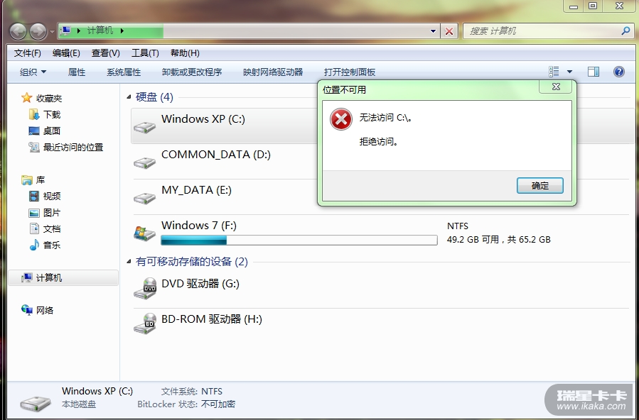 XP系统中,被保护的非系统分区显示成“带锁的文件夹”: