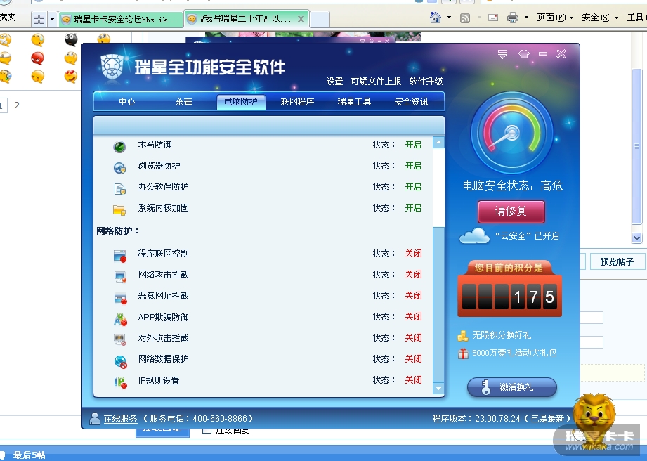 这个说来话长了,最早接触杀软是江民系列,从KV100开始,KV300,KV3000,等等,都有正版,现在还有软盘光盘什么的,但是跟瑞星不搭嘎,也就不上图了.用瑞星要从2004开始,就是开始蹭了,显示蹭的同学的,当时同学也不知道一个序列号能装多少台机器,那个时候还没有全功能,就是杀软+防火墙,于是我就蹭到手了一个序列号,杀软防火墙通用,用了3年,哈哈.后来就家里就一直用着,直到2007年吧,也差不多3年了,心想家里没提示过期就用着吧,当时大概是有3个月免费的版本吧,我记得是2007年,或者是2008年,我也记不清了,大概是那么个时候吧,反正到期后重装就又能用3个月,一年也就重装4次吧,还算比较省事的,反正免费嘛,后来听说英文版的免费一年,好像有这么个事儿,反正大概也就2008年吧,就一直蹭,蹭到瑞星免费,就没花一分钱,也算是瑞星的超级无敌吃白食的粉丝了.用户系统信息:Mozilla/4.0 (compatible; MSIE 8.0; Windows NT 5.1; Trident/4.0)