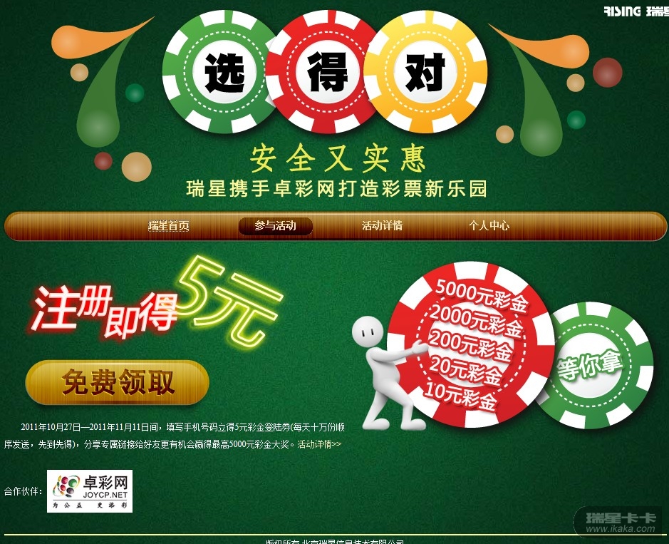 2011年10月27日—2011年11月11日间,填写手机号码立得5元彩金登陆券(每天十万份顺序发送,先到先得),分享专属链接给好友更有机会赢得最高5000元彩金大奖。