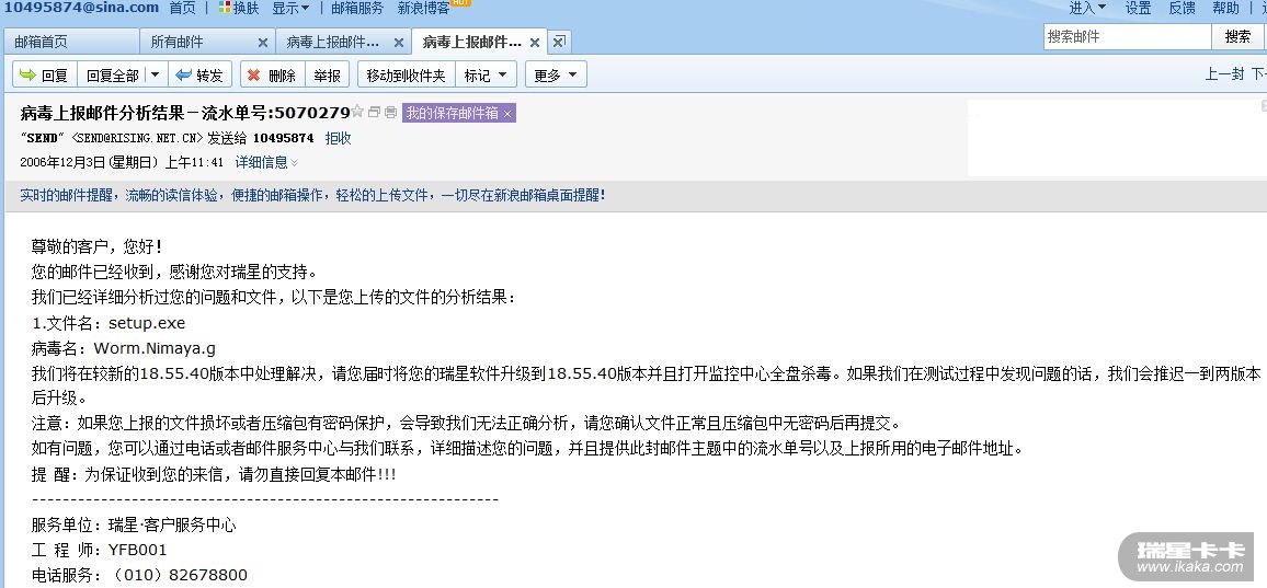 今天打开邮箱突然想起2006年给瑞星发的病毒文件时的反馈邮件!这也算是我与瑞星第一次互动吧!