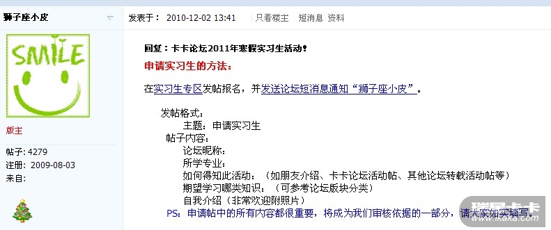 1.在寒假实习生招募说明中明确说明是发帖申请及站短“狮子座小皮”,看截图: