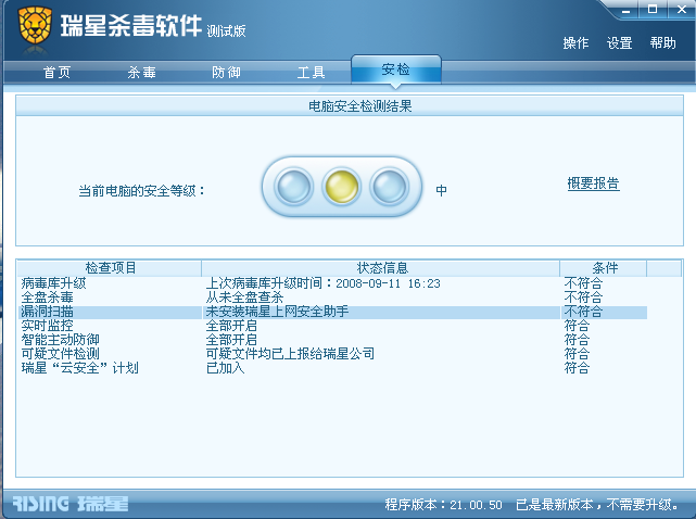 问题现象:瑞星已经升级到最高版本,但是安检中“病毒库升级”一项提示“不符合”;
