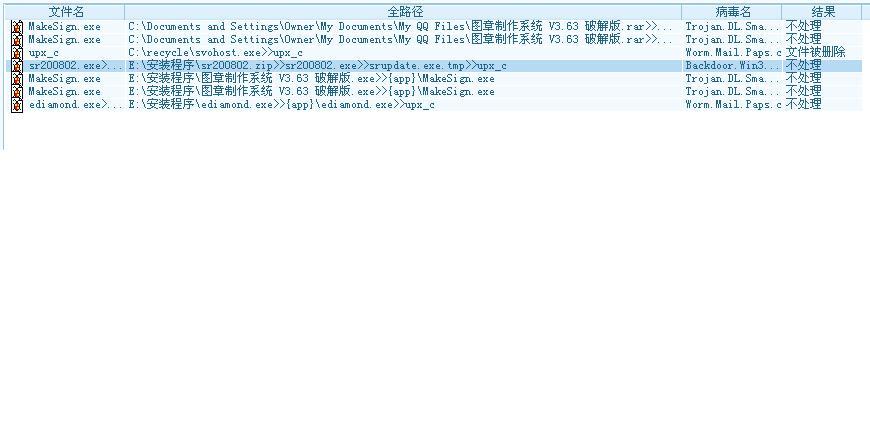 出现问题前的操作步骤:把此软件的可执行文件MakeSign.exe视为病毒并删除,但在杀毒记录中“结果”一项又显示为“不处理”
