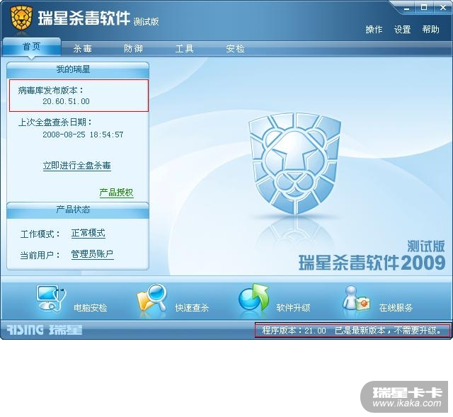 程序版本为21.00,已经为最新,但病毒库还是20.60.51.00,还是星期六的,但升级提示以最新!