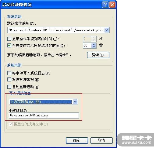 小存储器转储文件记录可帮助确定计算机为什么意外停止的最小的有用信息集。此选项要求启动卷上有一个至少为 2 MB 的页面文件。在运行 Microsoft Windows 2000 或更高版本的计算机上,计算机每次意外停止时 Windows 都会新建一个文件。