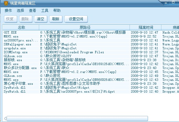 超级兔子软件和联众2.6你们可以到它们的官方网站下载,进行分析Returnil影子系统(多分区版)1.2 Setup我已经上传了,我只是个普通的计算机用户,不懂得如何提取误杀文件,有些文件在病毒隔离中恢复但恢复出来的文件却无法使用了,