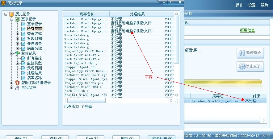 问题现象:我按了杀毒后由于无法清除病毒所以重启后删除但界面上显示不处理