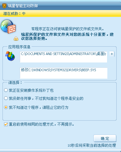 因为瑞星现在能查杀这个病毒,文件监控也能发现这个病毒,本测试主要针对主动防御,