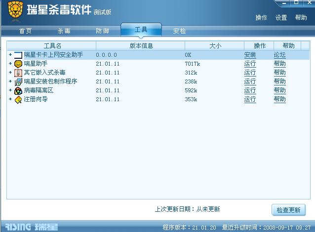 出现问题前的操作步骤:我先安装了卡卡,然后打开瑞星,看不到卡卡的版本,软件更新了,还是提醒从未更新