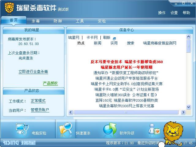 安装好后,打开瑞星软件主界面,界面比较清新的说~~