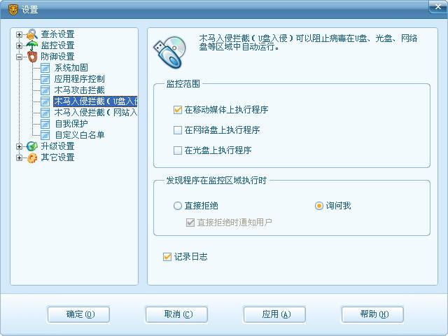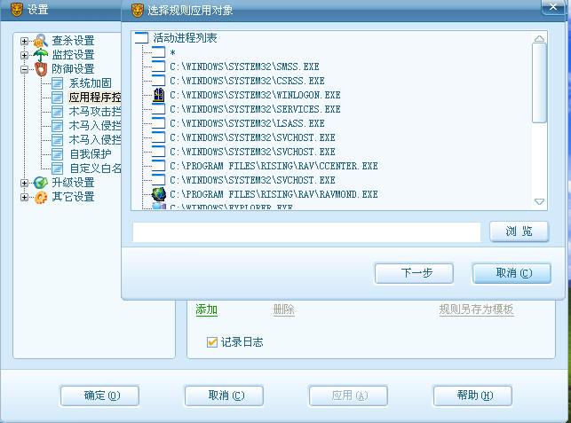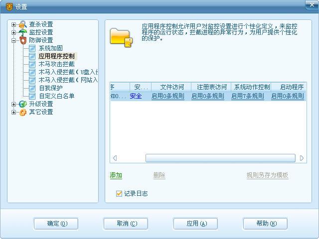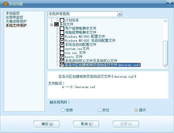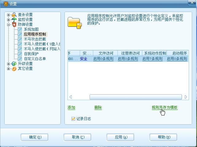 (1) 系统加固:由2008移植而来,打开它的界面仔细和08的对比下发现了一些新增的拦截点。首先,系统动作监控增加了“修改系统日期和时间”,“关闭电脑”,“使用摄像头”,“底层磁盘访问”等新的拦截点。对于那些恶意修改时间导致杀毒软件过期以,清除病毒中恶意关闭电脑的病毒,能强制开启摄像头的后门程序,类似机器狗等的从直接通过底层磁盘访问修改系统文件的病毒有了进一步的防御能力。