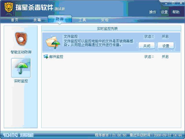 三、防御部分:可以看到瑞星09在这部分上花费了很大功夫。这部分已经将监控和原先的主动防御整合到一起,努力为用户构建立体防御体系