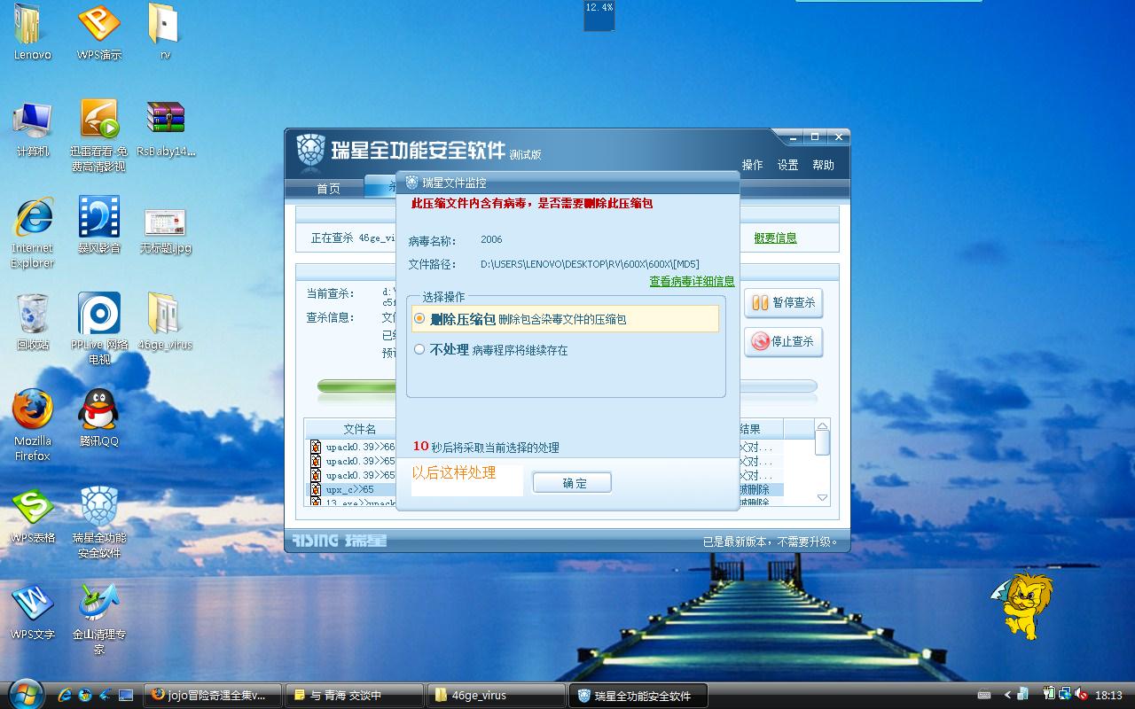 我用一个病毒包测试,瑞星询问了不下20次。。。烦死了!!!!建议添加复选框“重启前都这样处理”