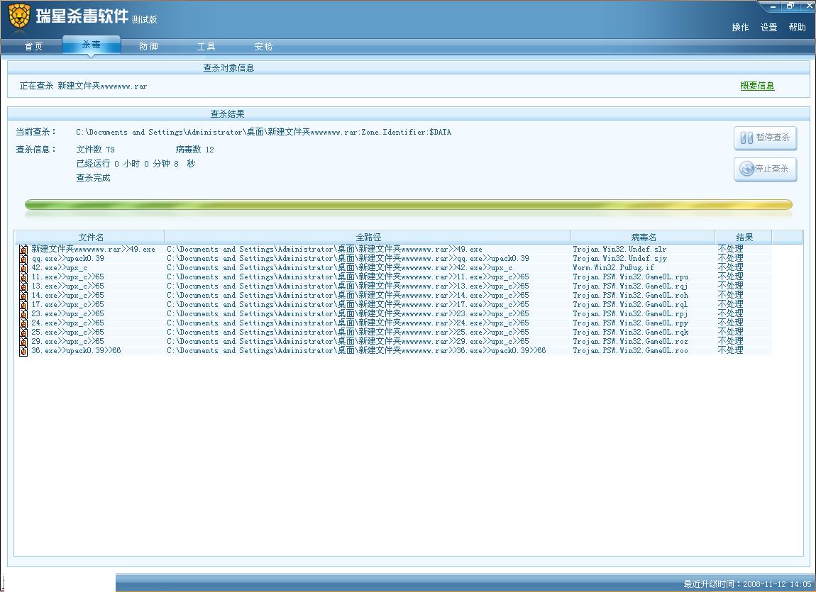 明白了,原来2楼把手动查杀级别设置成为最高了。。。呵呵这个没用的,瑞星还是没有特征