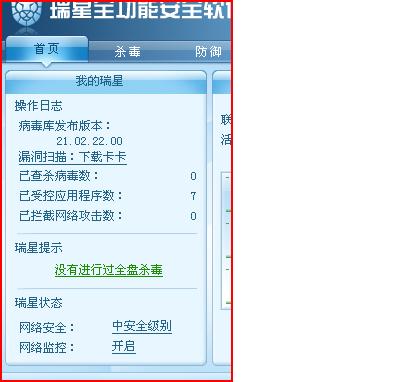 安全中心确实提示病毒库过期。瑞星2009全功能,病毒库号:21.02.22.00程序版本:21.15.35