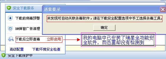 我的电脑安装的是瑞星全功能安全软件,可是迅雷的下载后病毒扫描无法启用瑞星全功能安全软件的杀毒程序(如下图),是不是瑞星全功能安全软件不支持迅雷下载杀毒模块。没有下载后立即查毒就难以避免恶意软件和病毒对电脑系统的侵害,希望瑞星联合迅雷推出瑞星全功能安全软件杀毒模块。