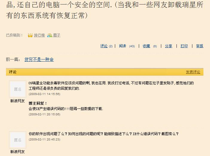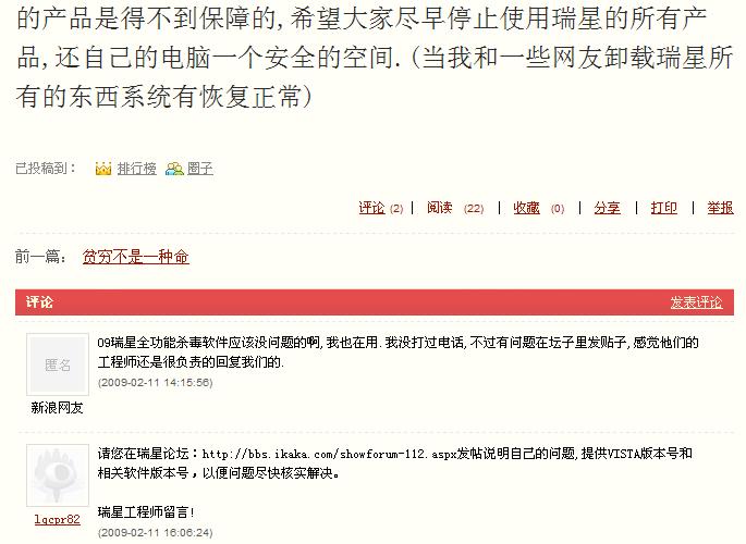 楼主最初在2009-02-10 19:21:41发布类似内容的博文后,瑞星工程师已两次尝试留言,希望与楼主建立联系确认问题,但两次留言均在回复10分钟内被删除,以至于问题无法确认。