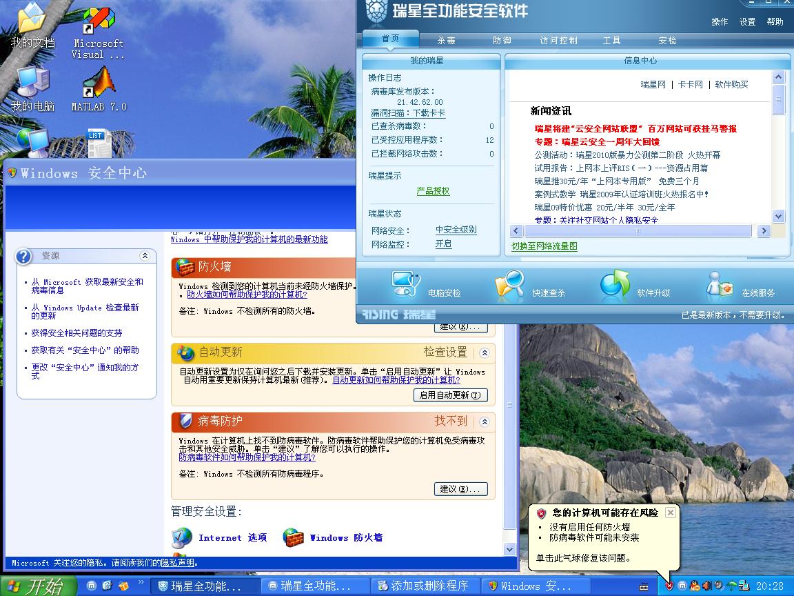 这是打开系统的病毒防护,关闭系统防火墙之后的结果,如果说关闭系统防护,打开系统防火墙当然什么都提示都不会有,这个不说我也知道,我只想说如果瑞星做了这么多年都得不到微软的承认,我真的很无语。