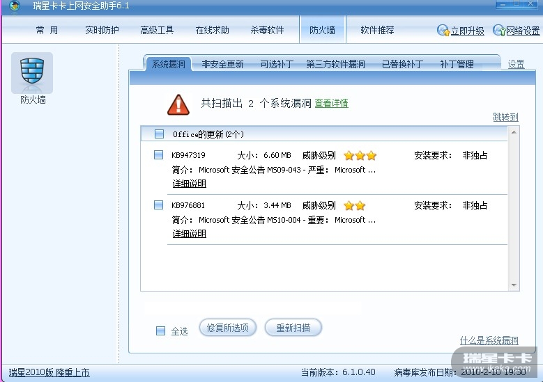 我的瑞星是刚买的2010全功能的,原来的系统装上之后不能使用,后来去销售点问,他又给换了个系统,倒是可以用了,但是我每次扫描总是显示有两个系统漏洞,我就按提示修复,但是重新开机再扫描后还是出现这两个补订,怎么弄都不行,修复了好几次了,而且我每次升级软件都提示说是最新版本,但是根本不是。想问问高手大哥们怎么办,我有扫描的日志和截图不知道有没有用!